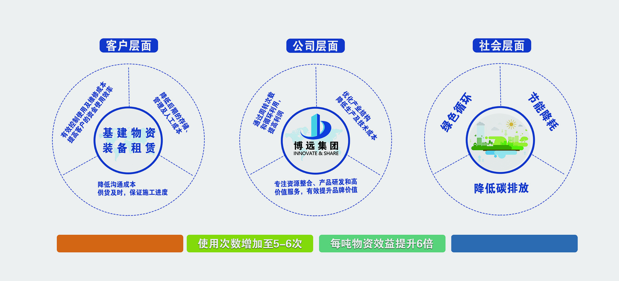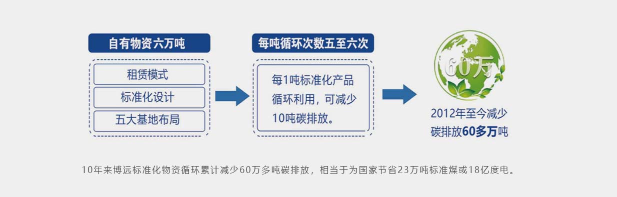 2013年博遠(yuǎn)首推行業(yè)物資租賃及標(biāo)準(zhǔn)化,整合行業(yè)、產(chǎn)業(yè)資源,盤活閑置物資,非標(biāo)品生命周期可由0.5年延長至3-5年,使用次數(shù)增加至5-6次,自2021年至今,博遠(yuǎn)標(biāo)準(zhǔn)化物資循環(huán)已累計(jì)減少碳排放60多萬噸,同時(shí)引領(lǐng)行業(yè)升級(jí),走出一條綠色循環(huán)之路,助力國家雙碳目標(biāo)實(shí)現(xiàn)。
