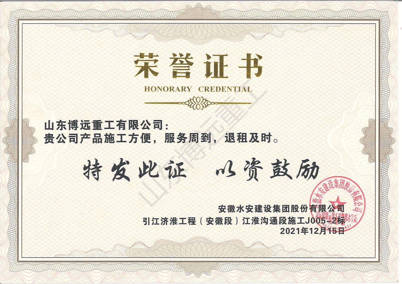 安徽水安建設(shè)集團(tuán)引江淮工程(安徽段)江淮溝通段榮譽(yù)證書(shū)